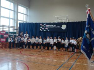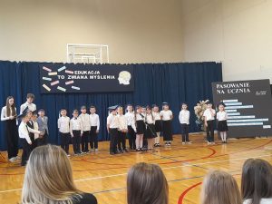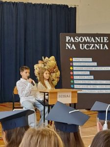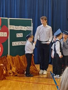 Dzieci złożyły uroczyste ślubowanie, obiecując być dobrymi uczniami, koleżeńskimi i sumiennymi w swoich obowiązkach szkolnych. Kulminacyjnym momentem uroczystości było oficjalne pasowanie na ucznia. Każdy z pierwszoklasistów podchodził do pani dyrektor, która symbolicznym dotknięciem dużego, drewnianego ołówka, pasowała ich na pełnoprawnych uczniów naszej szkoły. Uczniowie klasy pierwszej otrzymali ważny dokument, jakim jest e-legitymacja szkolna. Miłym akcentem kończącym uroczystość były książki od rodziców oraz pamiątkowe zdjęcia.