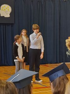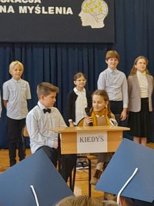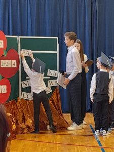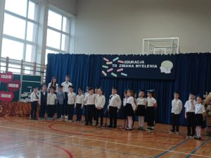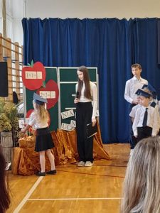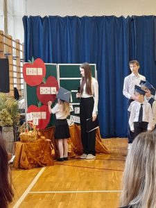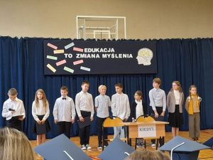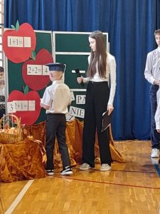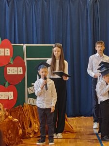 Program artystyczny przygotowała klasa V „a”. Uczniowie zaprezentowali wiersze oraz scenki humorystyczne związane z codziennym życiem szkolnym, które wywołały uśmiech na twarzach zgromadzonych. Uroczystość zakończyła się wspólnymi podziękowaniami i życzeniami dla całej społeczności szkolnej oraz rozdaniem wyróżnionym nauczycielom nagród Wójta Gminy Czarna i Nagród Dyrektora.
