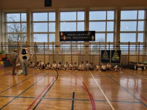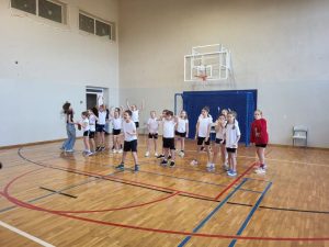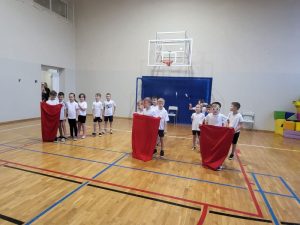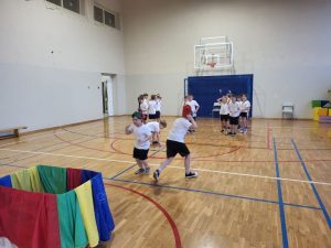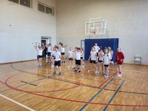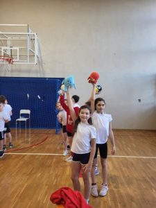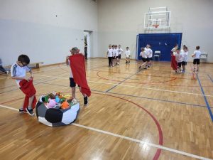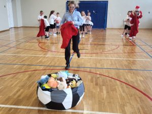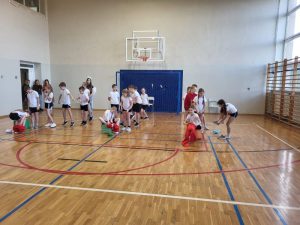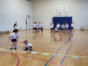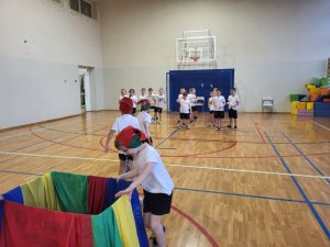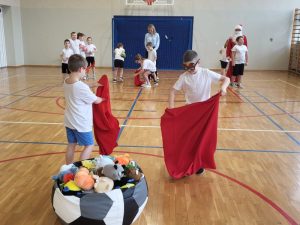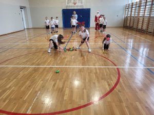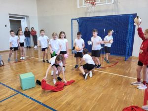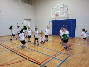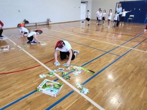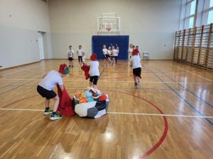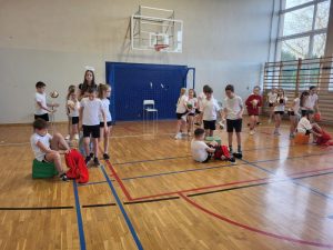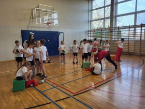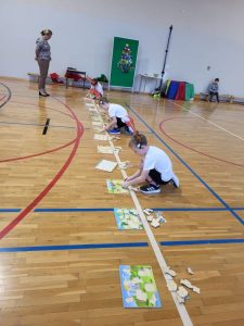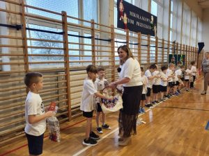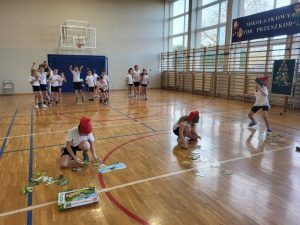 Za udział w konkurencjach uczniowie zdobywali punkty, które następnie wymieniali na słodkie nagrody. Co ważne – cukierki były dzielone między członków drużyn, ucząc współpracy, dzielenia się i wspólnej radości z sukcesu.
