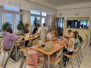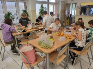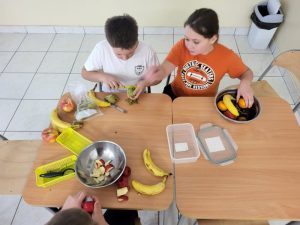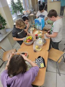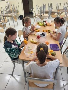 Zajęcia były bardzo aktywne i angażujące – uczniowie chętnie uczestniczyli w rozmowach, zadawali pytania i poznawali produkty, które warto włączyć do diety, oraz takie, których należy unikać. Każdy przyniósł również owoce, z których w stołówce szkolnej wspólnie przygotowano smaczne, kolorowe sałatki. Cieszyły się one ogromnym zainteresowaniem i zniknęły w ekspresowym tempie.