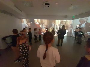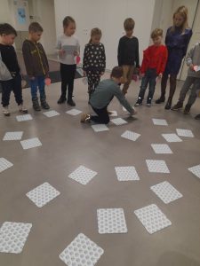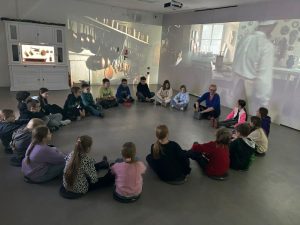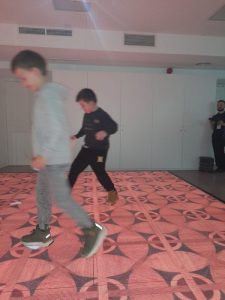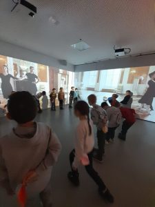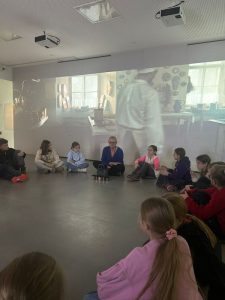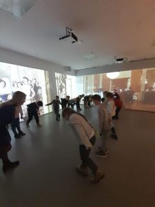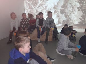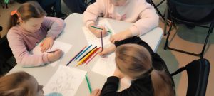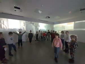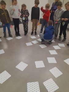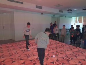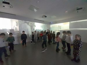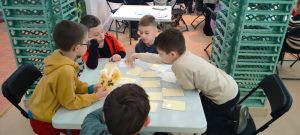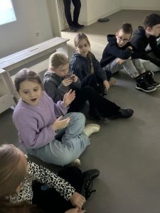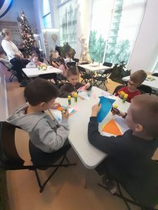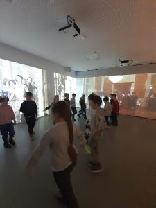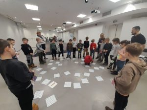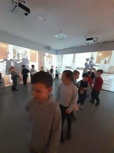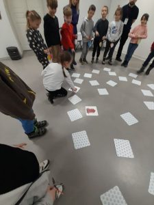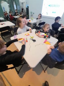 Z kolei uczniowie klas pierwszych również uczestniczyli w zajęciach artystycznych. Podczas warsztatów z dużym zaangażowaniem wykonywali balony z kolorowego papieru, następnie obejrzeli pokaz tańca manuet, a nawet nauczyli się podstawowych kroków tego eleganckiego tańca dworskiego. Wiele radości sprawiła im także gra memory.