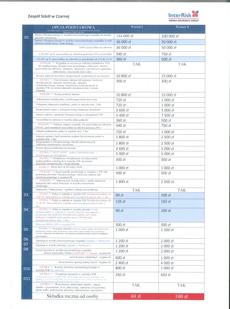 Rodzice mają możliwość ubezpieczenia swoich dzieci w TU InterRisk w ubezpieczeniu grupowym (oferta specjalna dla uczniów z terenu naszej gminy)