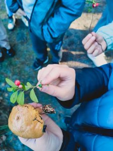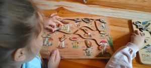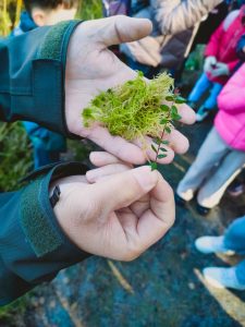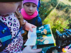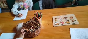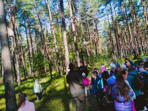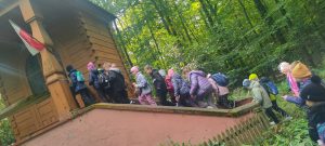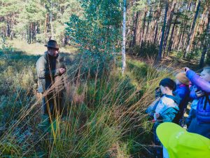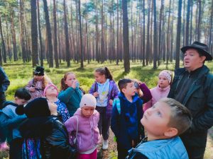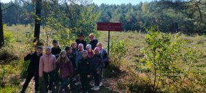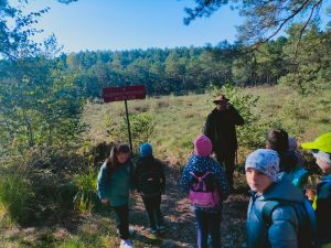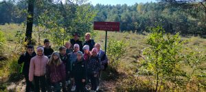 Kolejnym punktem programu było zwiedzanie masztu widokowego oraz przemarsz do lasu. Pan leśniczy rozdał dzieciom naturalne zakładki do książek z miłorzębu. Następnie opowiedział o drewnianych budkach lęgowych, które raz w roku są czyszczone. Udaliśmy się do Rezerwatu Przyrody Suchy Łuk, gdzie dowiedzieliśmy się wielu ciekawych rzeczy na temat torfowisk i gatunków w nich występujących oraz czym różni się ochrona czynna od biernej. Jednak dla wielu uczniów największą atrakcją okazało się grzybobranie, a trzeba przyznać, że grzybów tej jesieni jest wyjątkowo dużo.